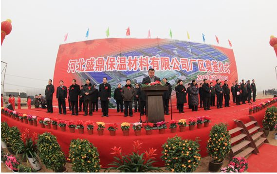 2011年12月20日,河北盛鼎保溫材料有限公司在河北省阜城經(jīng)濟開發(fā)區(qū)舉行了隆重的奠基儀式。中國絕熱節(jié)能材料協(xié)會秘書長胡小媛到會祝賀并致辭,衡水市委常委崔士霞,市人大副主任吳平、市政協(xié)副主席石金義,阜城縣委書記姚幸福、縣長石躍輝等出席奠基儀式。