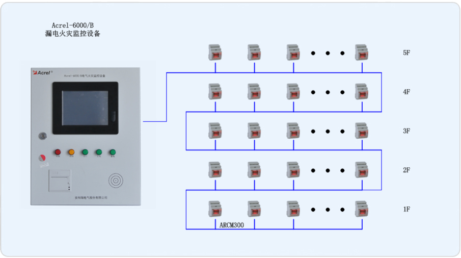 系統組網共分為站控管理層、網絡通訊層、現場設備層三層,該項目通訊總線共接入一條通訊總線,總線在樓層配電箱手拉手串接后,接入壁掛式后臺,組成電氣火災系統的大動脈。箱體中漏電流互感器通過電流線接入漏電探測器,漏電探測器實時顯示漏電情況,組成一套信號穩定,精度可靠的電氣火災監測系統。