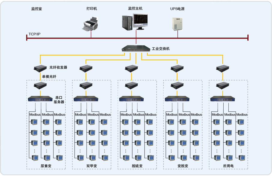 本項(xiàng)目針對(duì)現(xiàn)場(chǎng)3個(gè)低壓配電室(A、B、C)內(nèi)安裝的100只左右電力儀表。監(jiān)控室在A配電室內(nèi),B配電室距離A配電室200米左右,儀表為20只左右。另一個(gè)C配電室距離A配電室600米左右,儀表為40只左右。