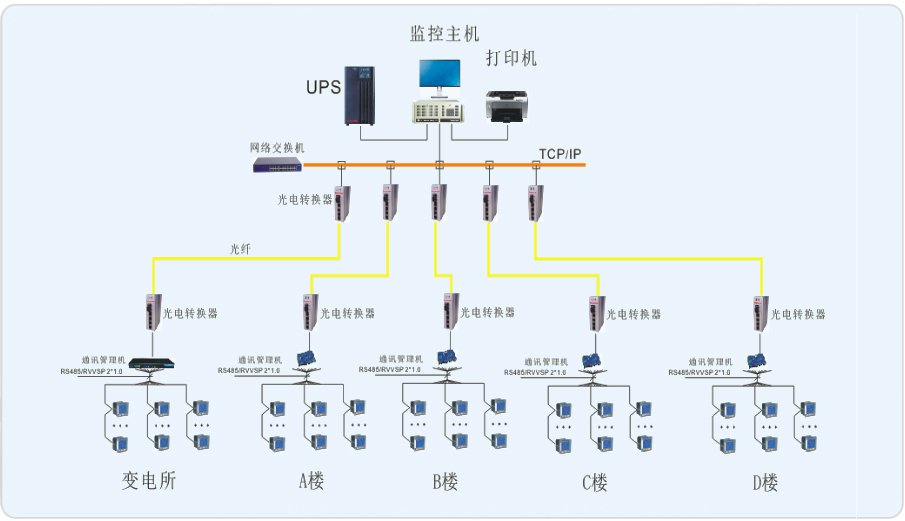 上海金橋德勤通用廠房共1個10KV/0.4KV配電房,在配電房內有0.4KV的安科瑞PZ96L-E4儀表102塊;A#有安科瑞PZ96L-E4儀表13塊,B#有安科瑞PZ96L-E4儀表8塊;C#和D#分別有安科瑞PZ96L-E4儀表4塊,上海金橋德勤通用廠房共用安科瑞儀表133塊。對于上海金橋德勤通用廠房的配電情況,在每棟大樓里安放了采集器通過光纖到A棟的消防控制室,配電房的儀表連接至安放在配電室旁邊的通訊機柜再通過光纖到消防控制室,將所有的儀表連接一起,實現對上海金橋德勤通用廠房用電的實時管理。