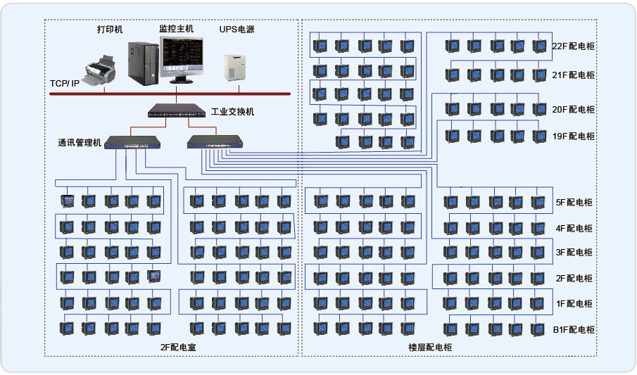 上海百樂門大酒店電力監控系統監控范圍為百樂門大酒店的22個樓層的PZ系列電力儀表和配電室的PZ、ACR系列電力儀表進行遠程監測。現場設備全集中在同一個配電室中,業主的電氣值班室就近安排在配電室旁,本系統監控中心也安置在該值班室中。系統組網采用常見的3層結構,站控管理層、通訊管理層和現場設備層。