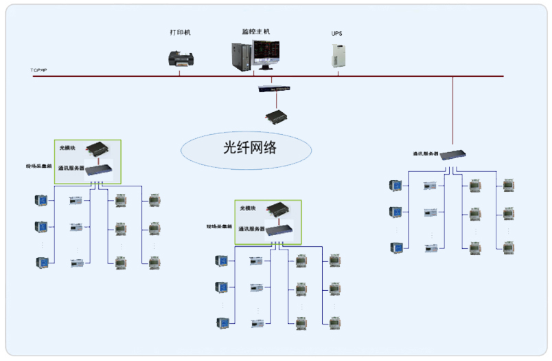 系統采用Acrel-3000型電能管理系統,整個系統采用網絡分布式結構,監控主機位于主樓監控中心,其他兩棟輔樓采用采集箱進行數據的采集,所有配電回路均配備安科瑞電力儀表PZ系列、DTSY1352和DDSY1352系列。該項目實現了歐蓓沙中華美食城的配電管理及。所有監控設備均通過屏蔽雙絞線至各自采集箱的通訊采集器,再通過光電轉換器經過光纖將數據傳輸至監控中心,從而實現遠程監控和預付費管理。
