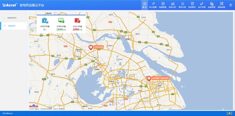 結合電子地圖顯示變電所的分布情況,并匯總變電所數量、累計裝機容量、累計運行容量等信息,提供查看對應變電所詳細信息的入口。